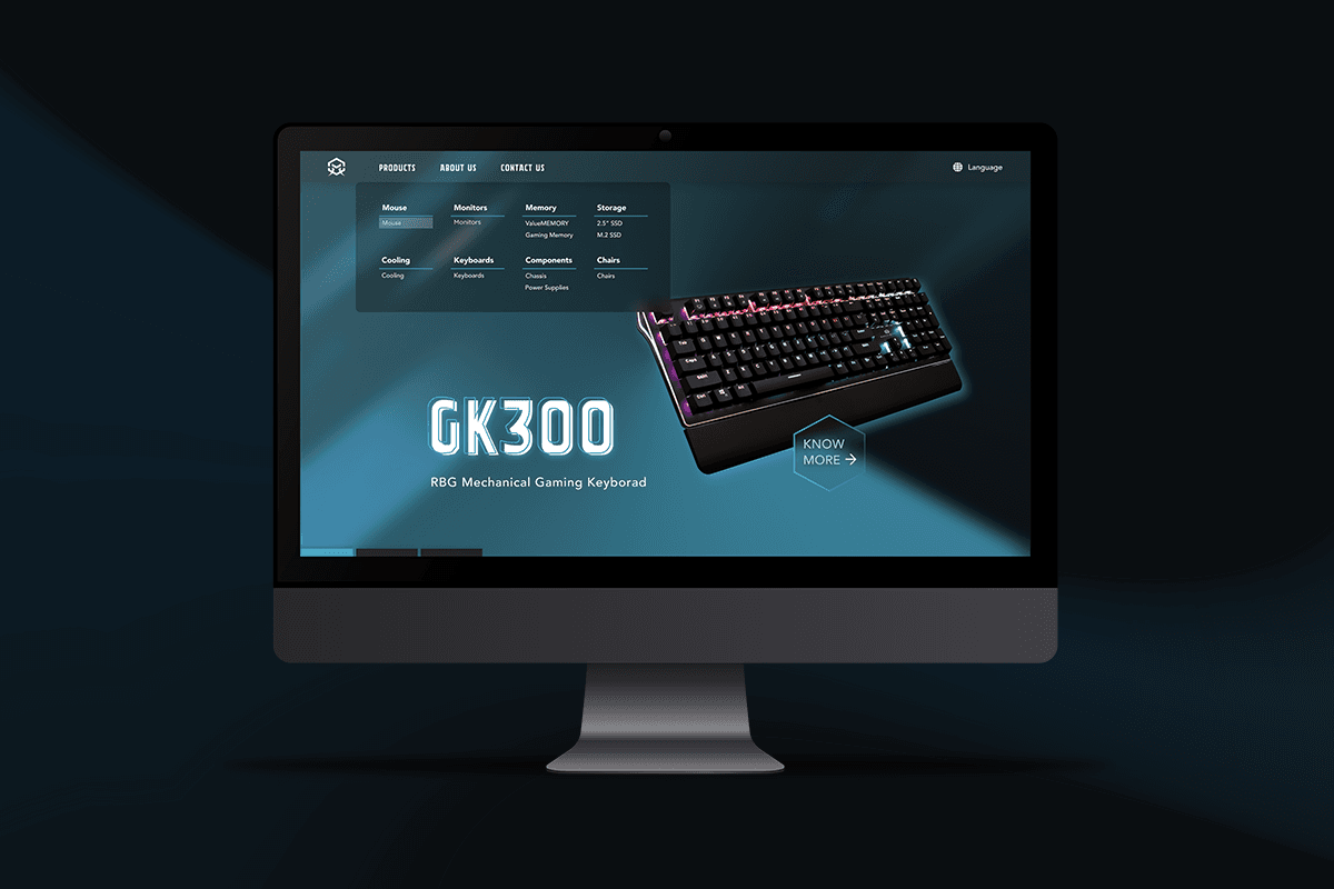 以 品牌 LOGO 的六邊形去做發想,將 Rogueware 的象徵元素帶進網站,結合品牌標準色與科技感的配色做搭配。毛玻璃的層次設計,及六邊形的產品圖連結著品牌調性,加入滾動視差展現出科技的空間,讓網站更顯電競、數位感。